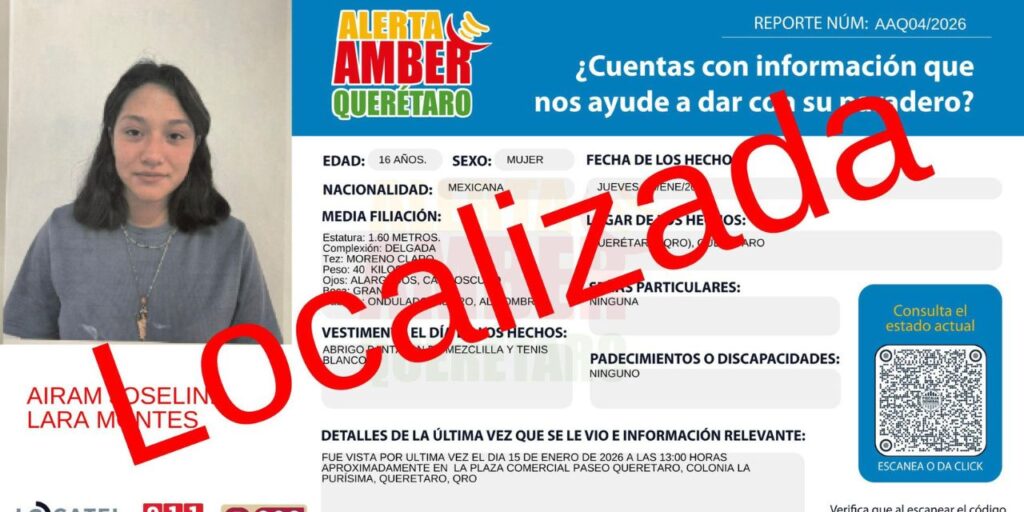 La Fiscalía General del Estado de Querétaro informa que, derivado de la activación de la Alerta AMBER emitida el pasado 17 de enero, se logró la localización de Airam Joseline Lara Montes.